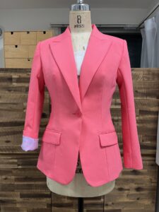 色が可愛らしいから、ラペルはピークドラペルにしてキリッと引き締まるようにしました。